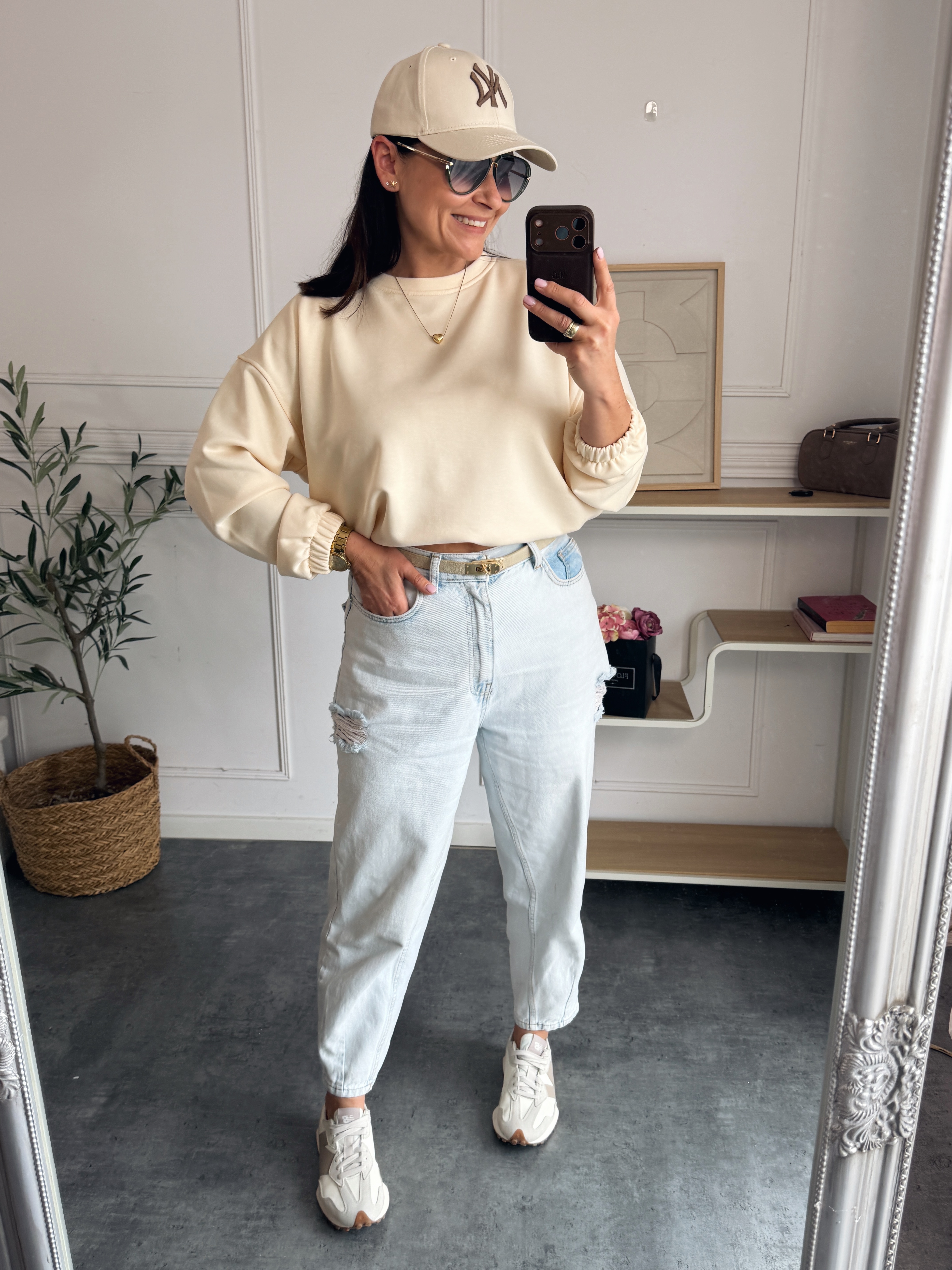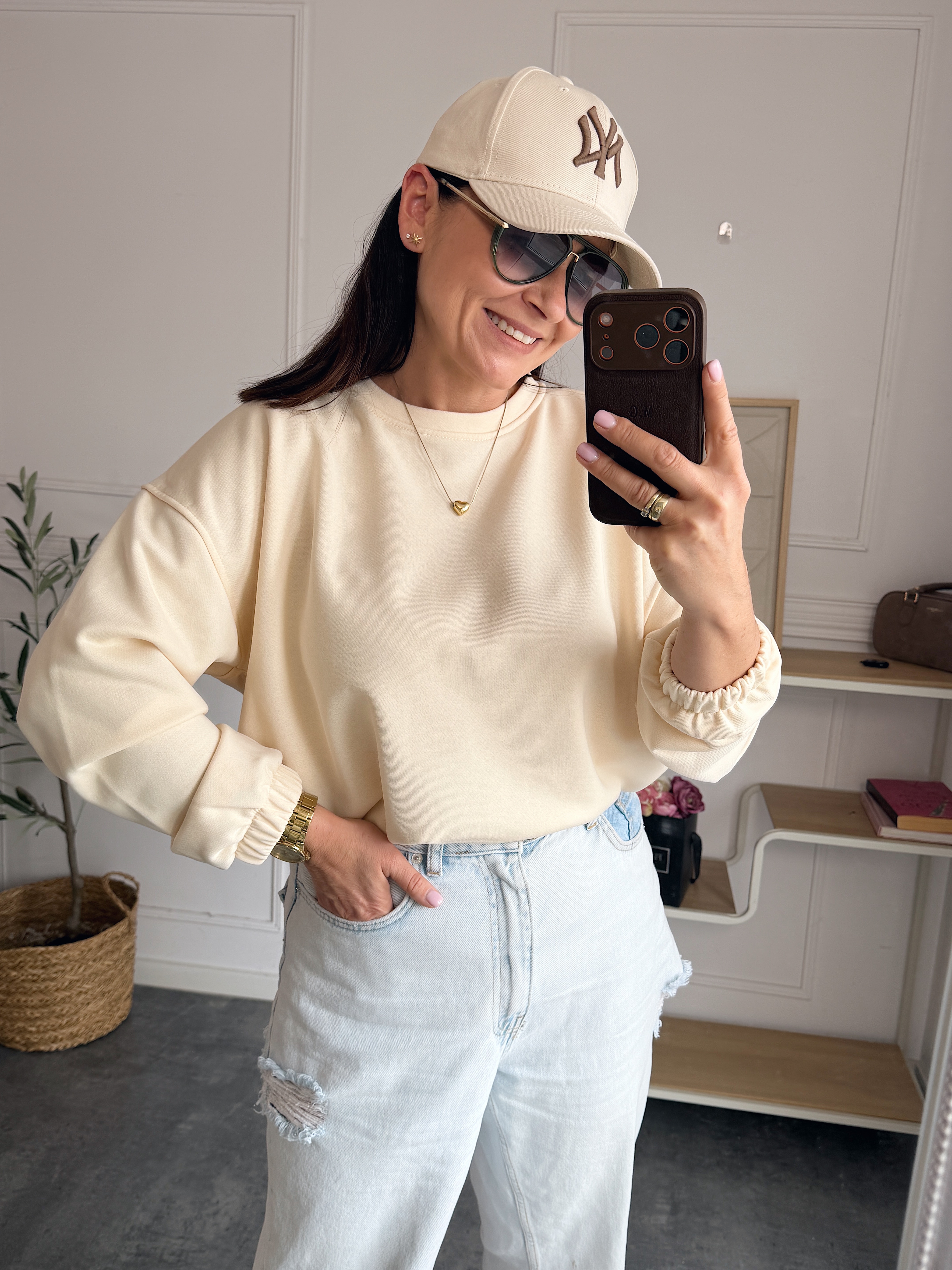 Klasyczna bluza o krótszym kroju w pięknym waniliowym kolorze , posiada w dolnej części zamiast ściagacza, gumeczki do zbluzowania ( regulacja)