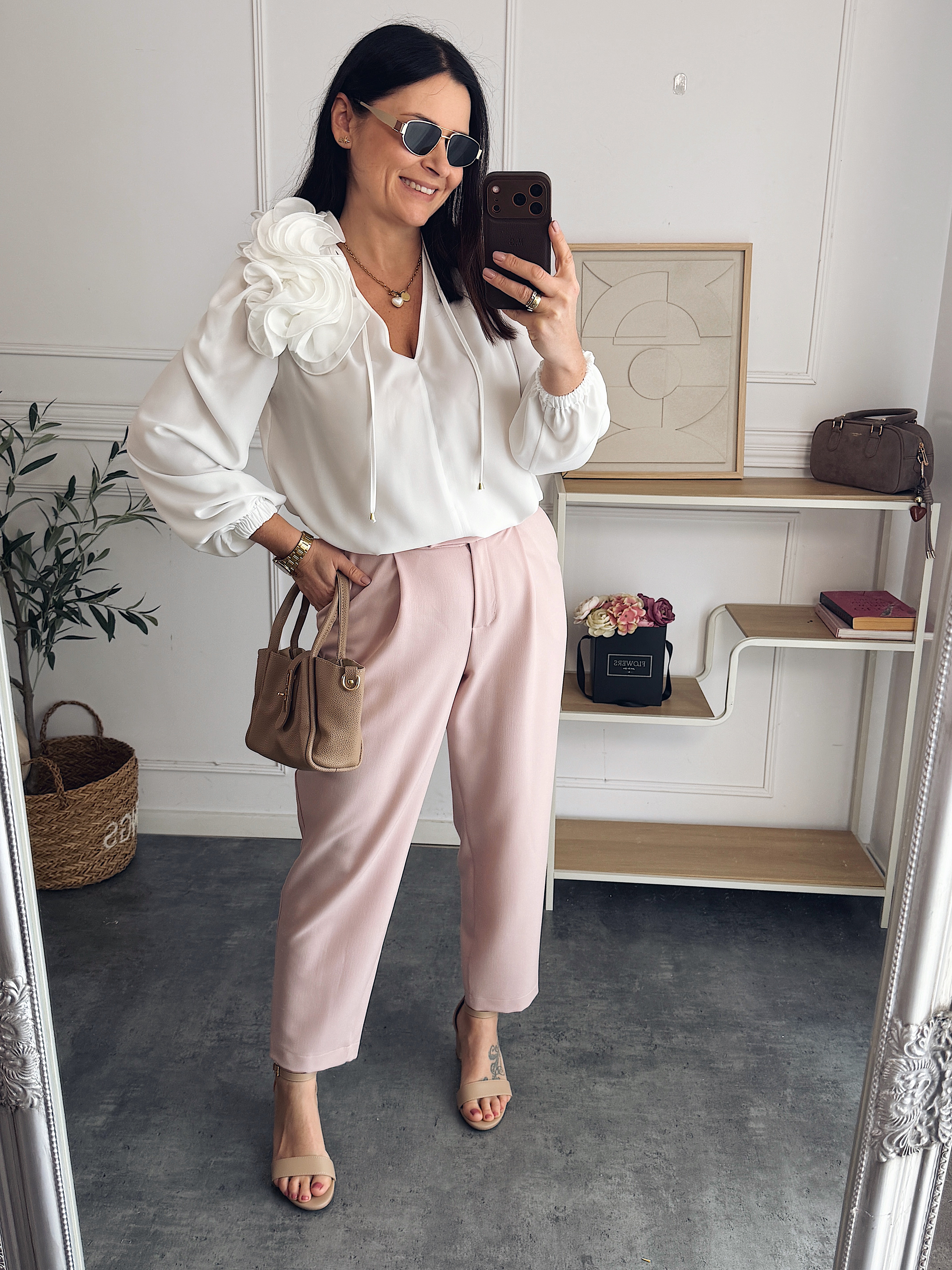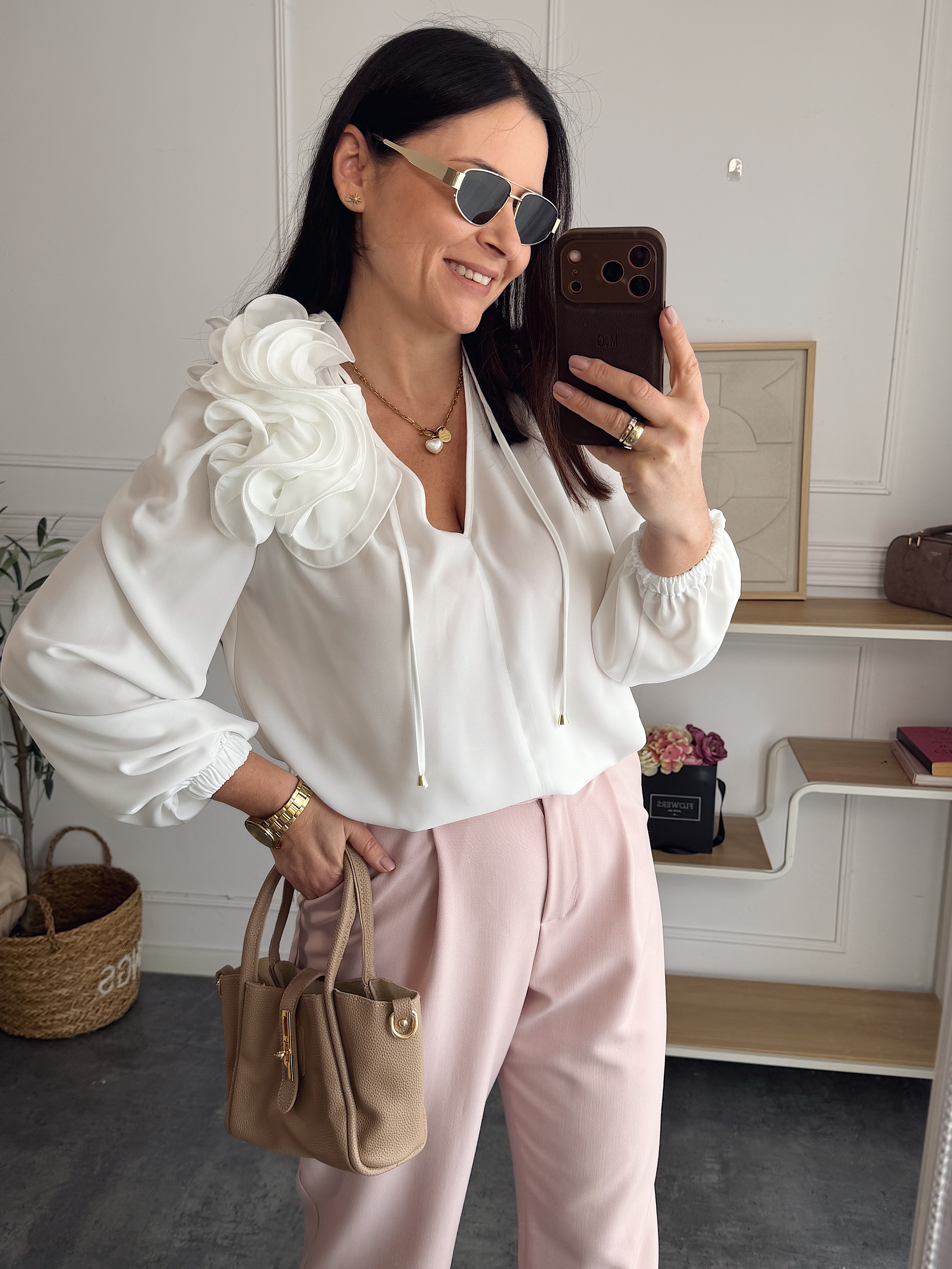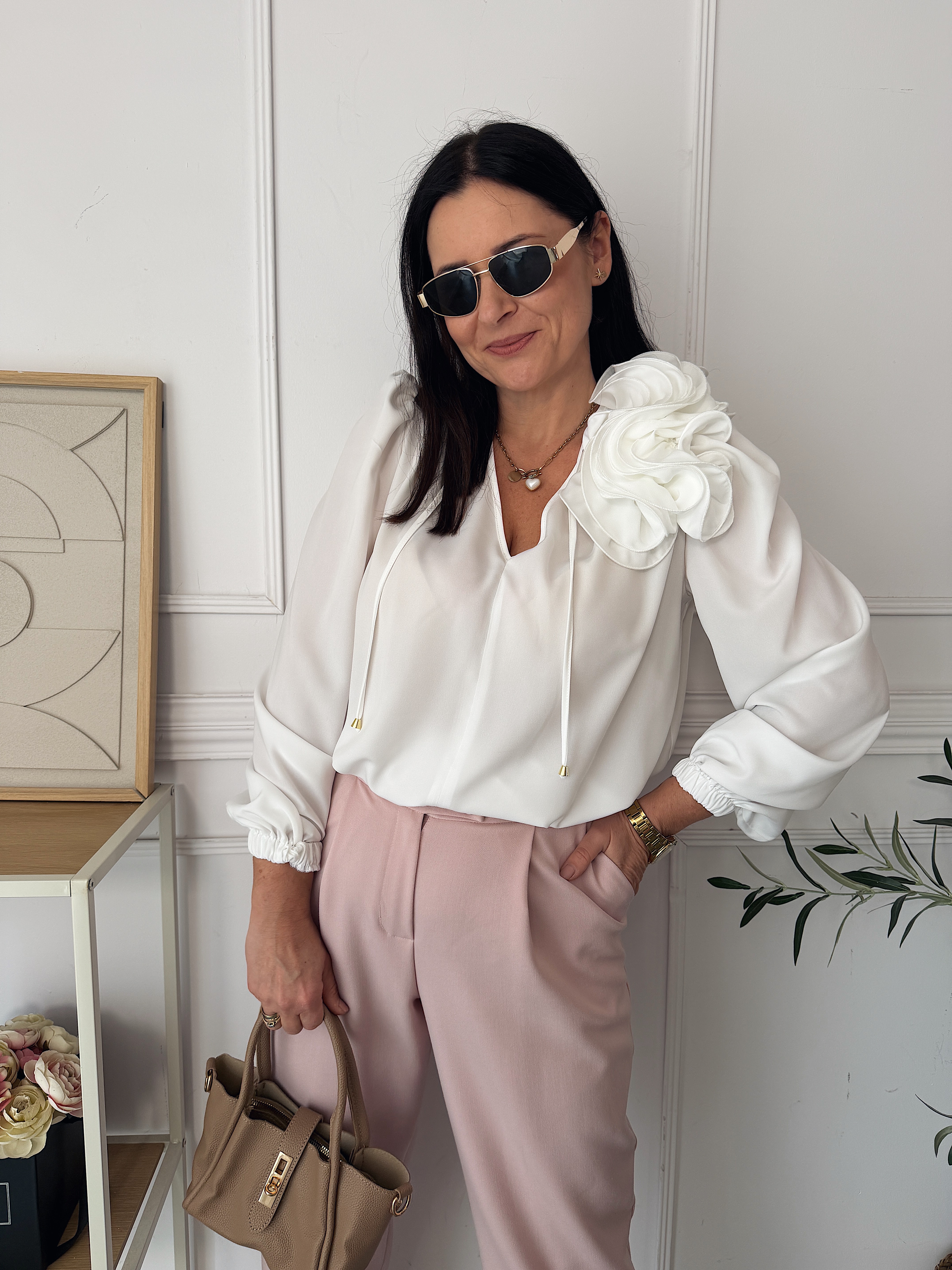 Piękna bluzka wykonana z delikatnego zwiewnego lejącego materiału , z ozdobnym kwiatem na ramieniu .