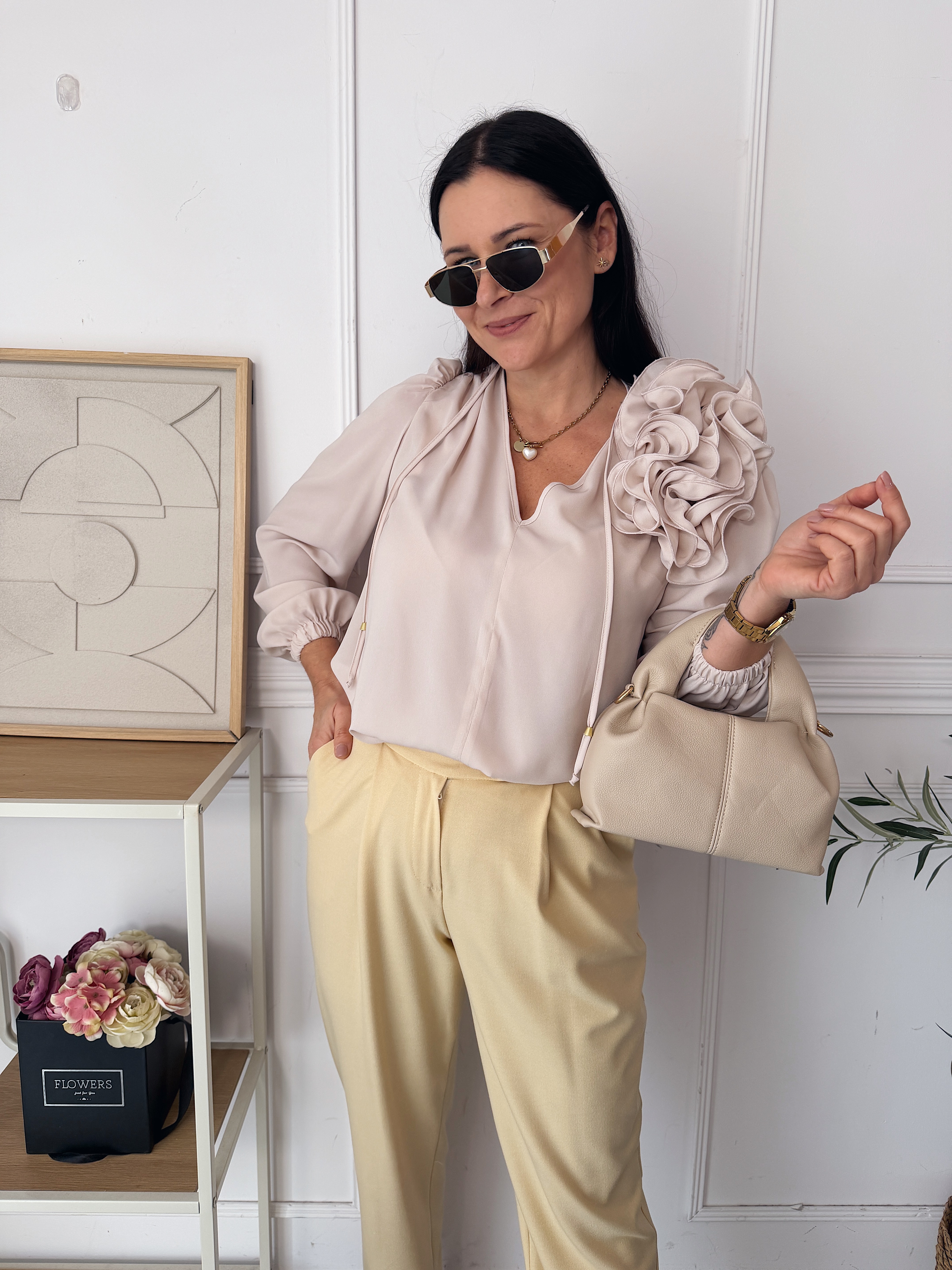 Piękna bluzka wykonana z delikatnego zwiewnego lejącego materiału , z ozdobnym kwiatem na ramieniu .