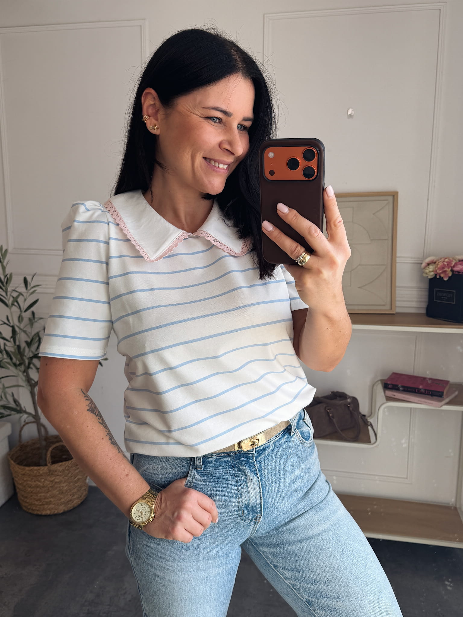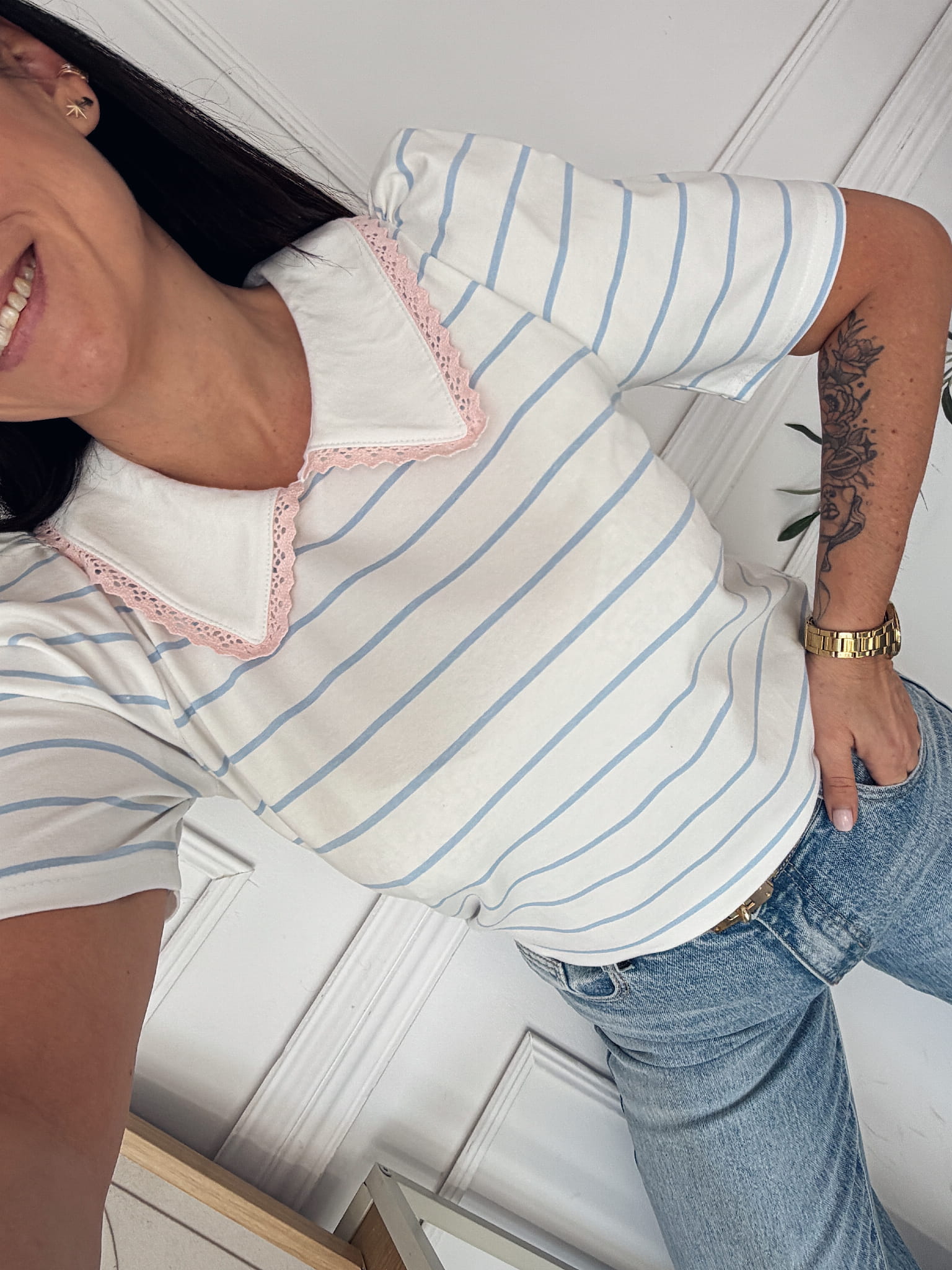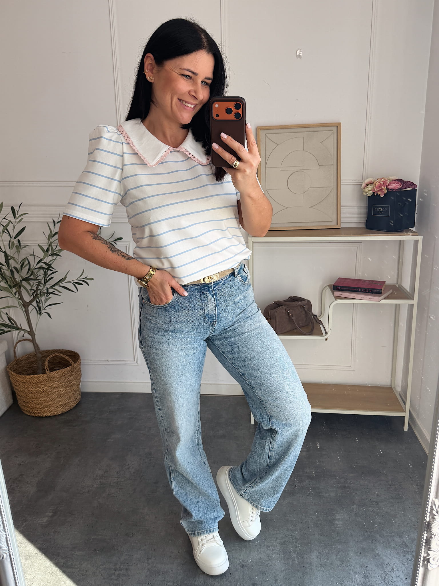Basic z delikatnymi poduszkami na ramionach i ozdobnym kołnierzykiem w piękne pastelowe paseczki.