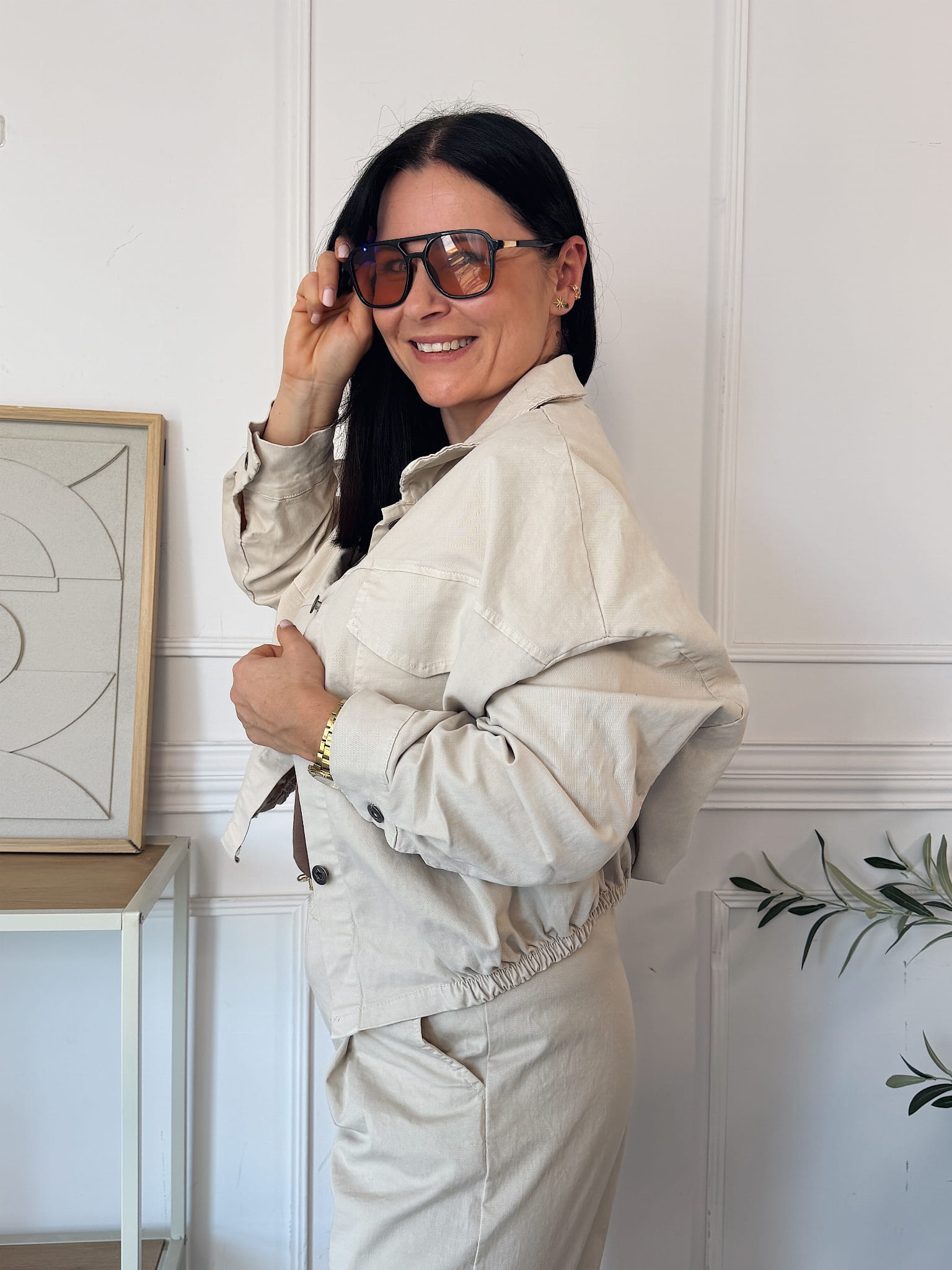 Katana bawełnianan o kroju bomberki ( z tyłu wszyta gumeczka) , zapinana na guziki , mankiety zakończone guziczkiem.