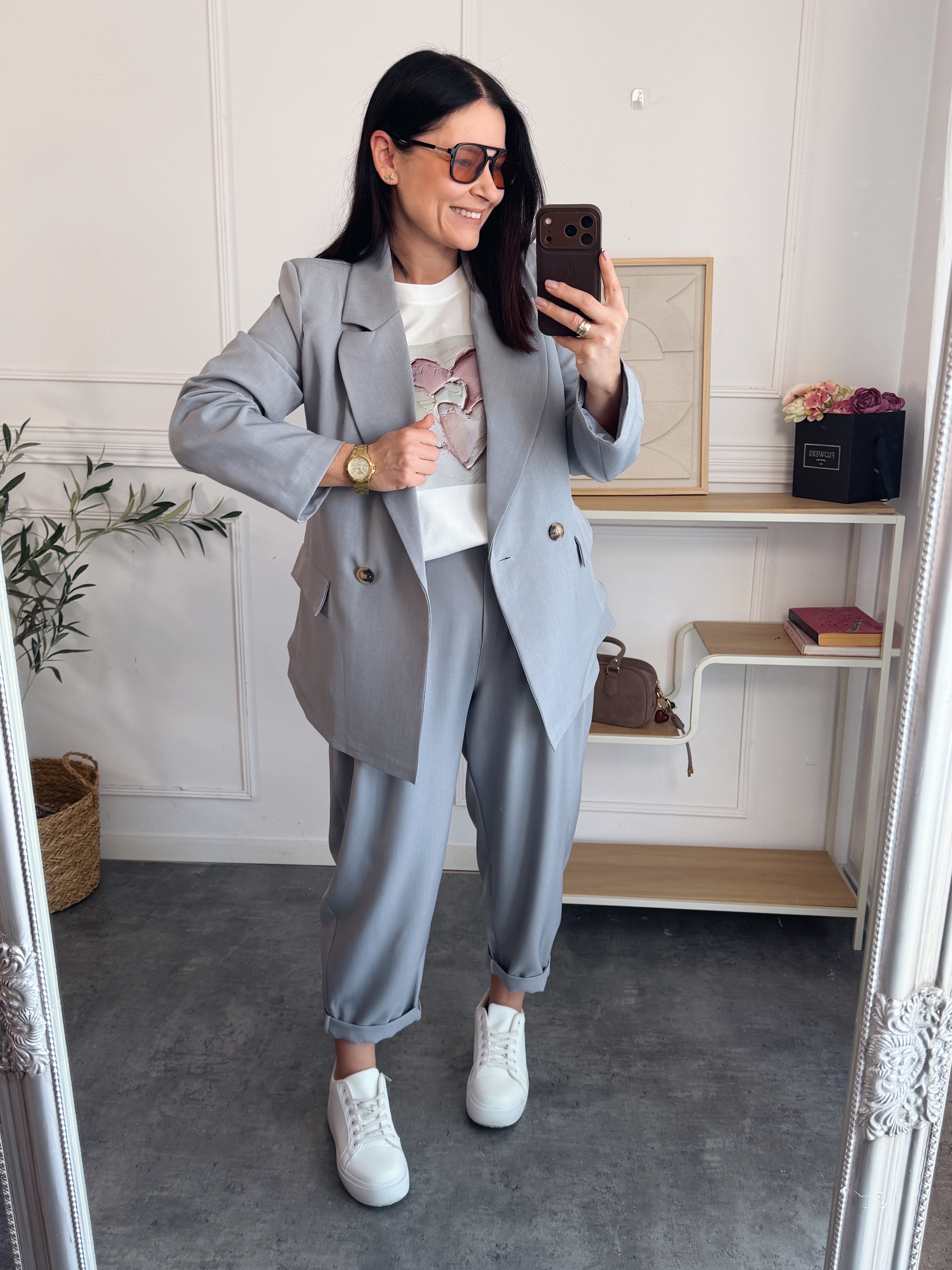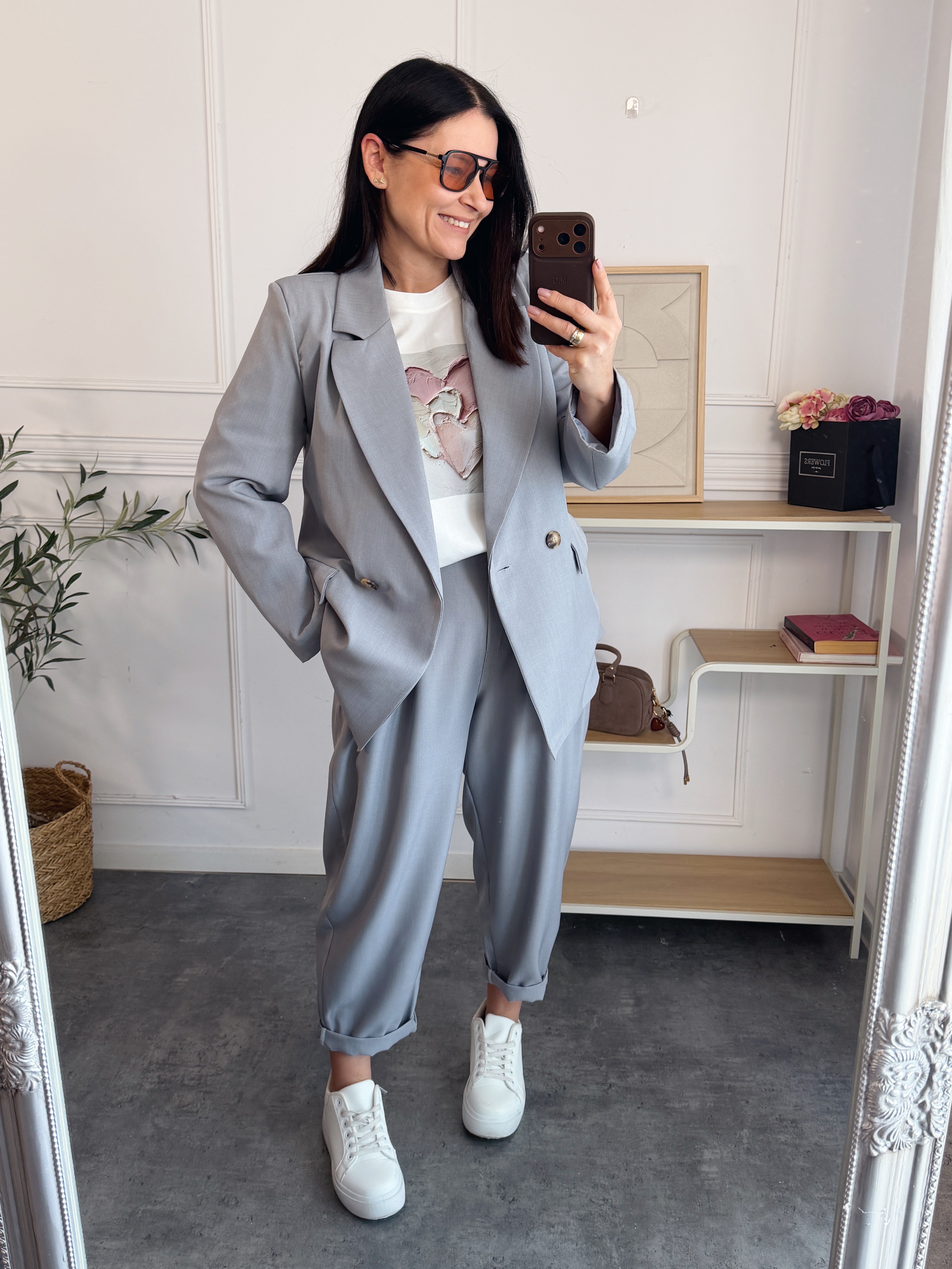 Elegancki komplet składający się z marynarki oraz spodni typu balon to stylowa propozycja, która doskonale sprawdzi się zarówno w eleganckich, jak i codziennych stylizacjach. Całość tworzy spójny, nowoczesny zestaw, który można nosić razem lub łączyć osobno z innymi elementami garderoby.