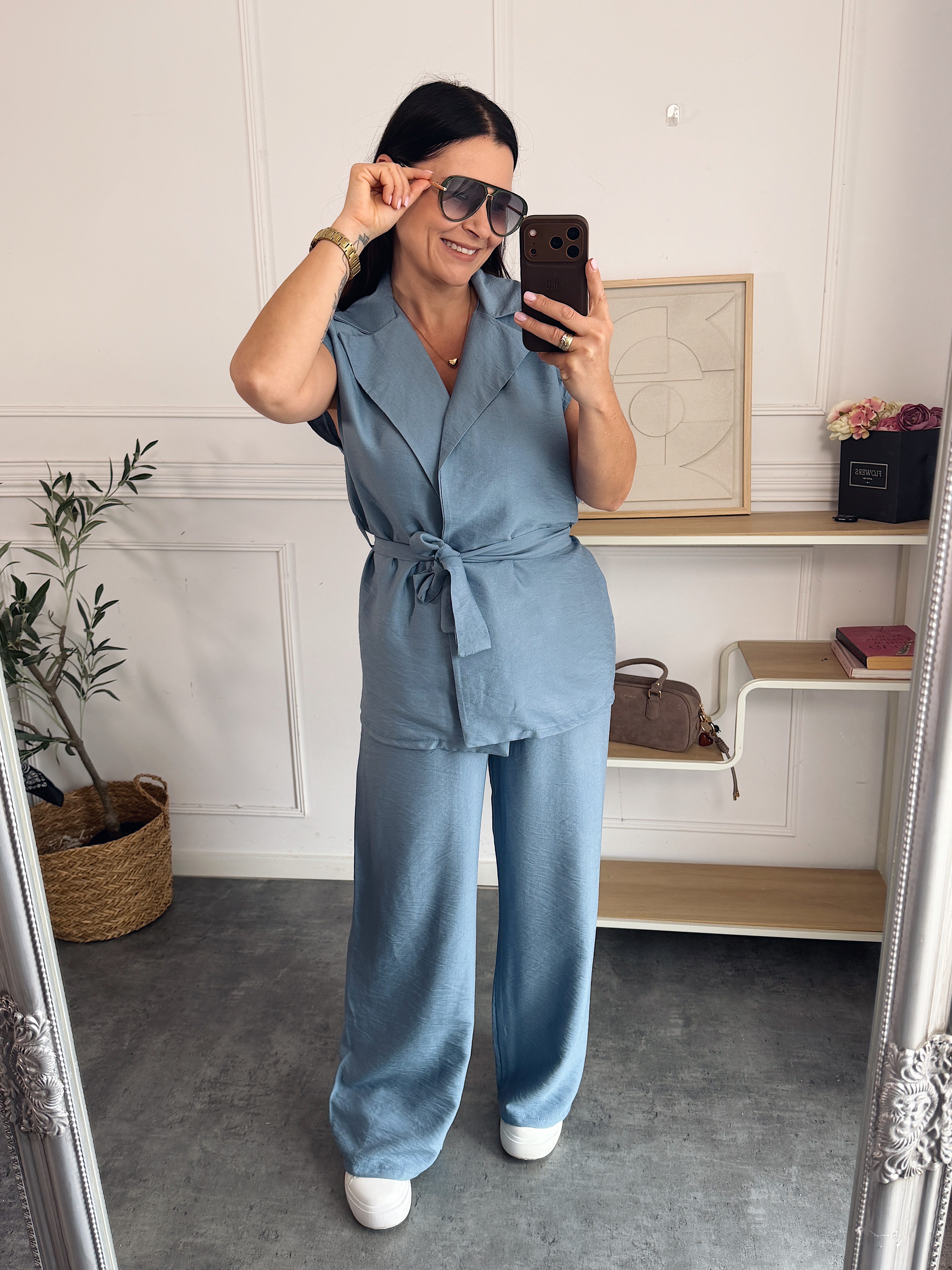 Komplet składający się z kamizeli bez zapięcia/przewiązywanej paskiem oraz spodni na gumie.