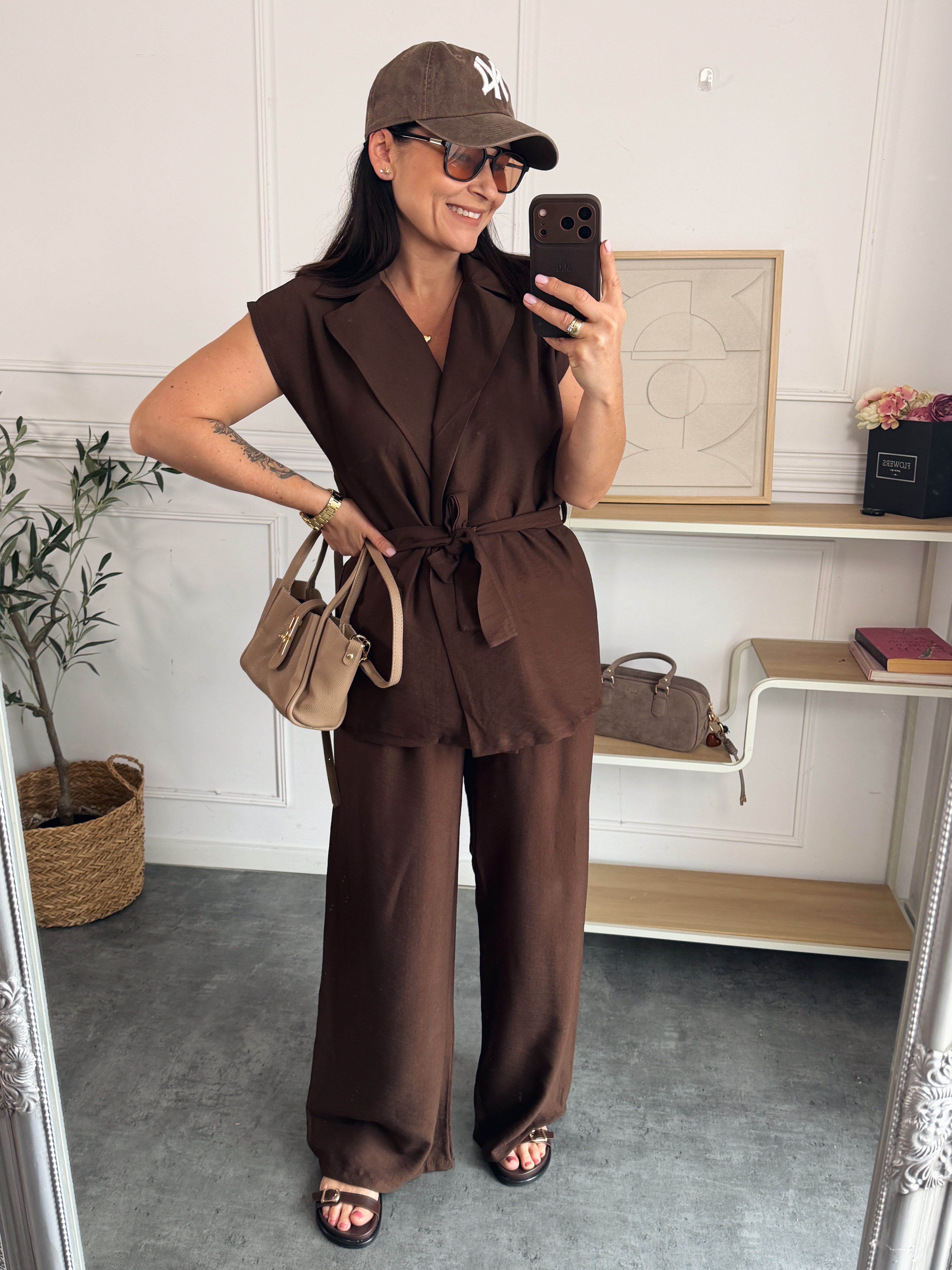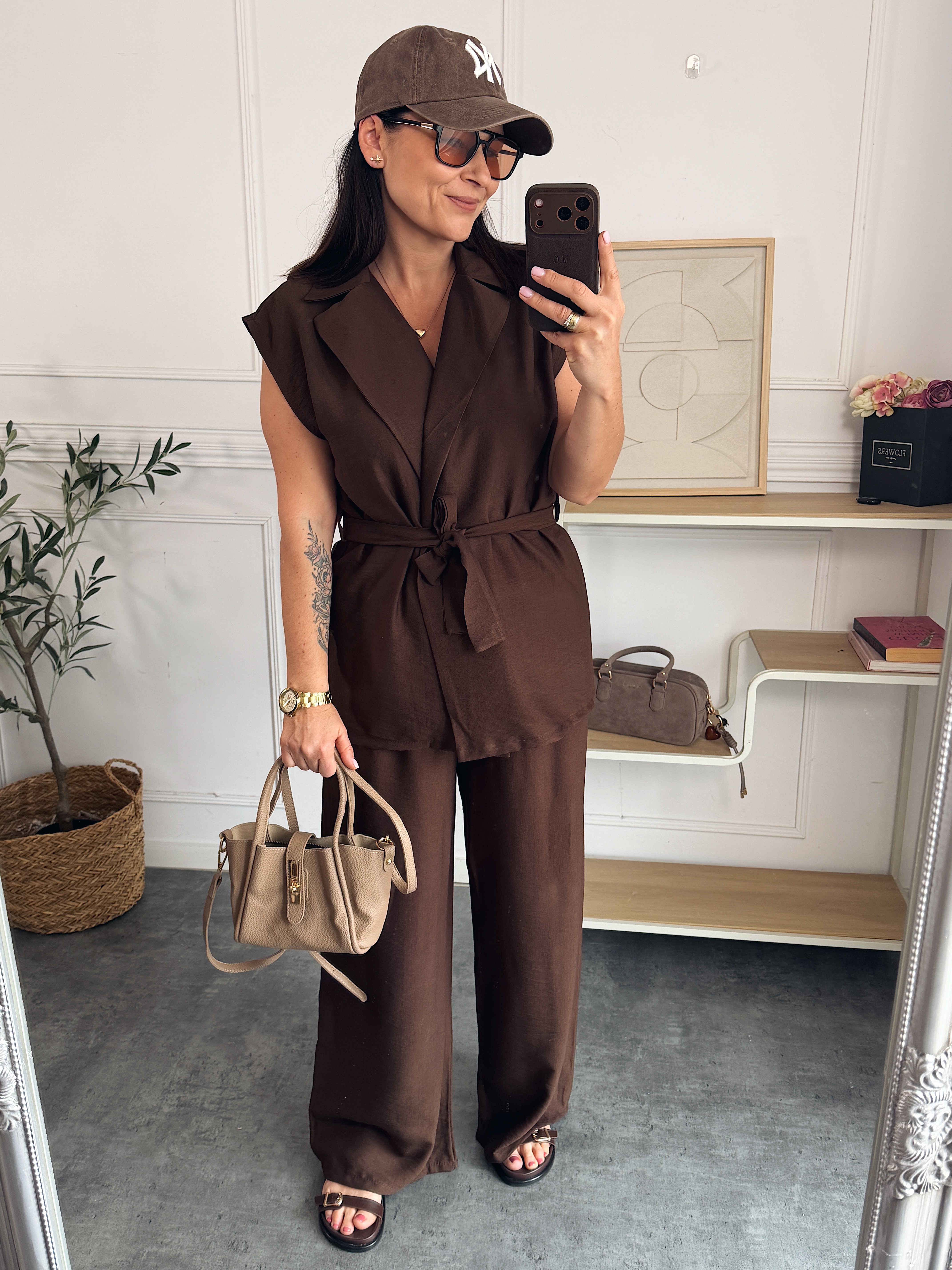 Komplet składający się z kamizeli bez zapięcia/przewiązywanej paskiem oraz spodni na gumie.
