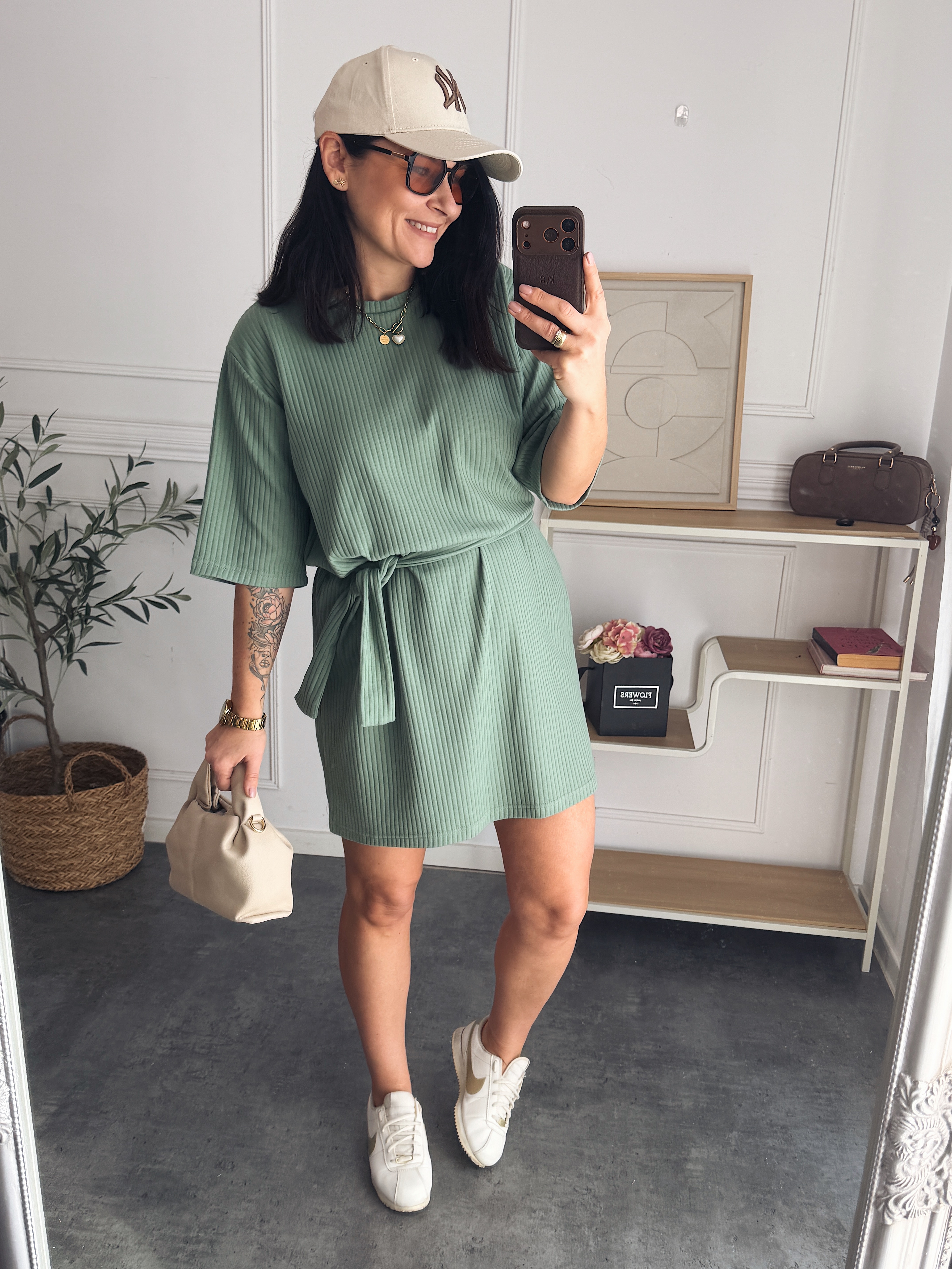 Do Sukienki dołączony jest pasek, dzięki któremu możesz nosić ją na dwa sposoby — luźno, dla bardziej sportowego efektu, lub przewiązaną w talii, aby podkreślić sylwetkę.