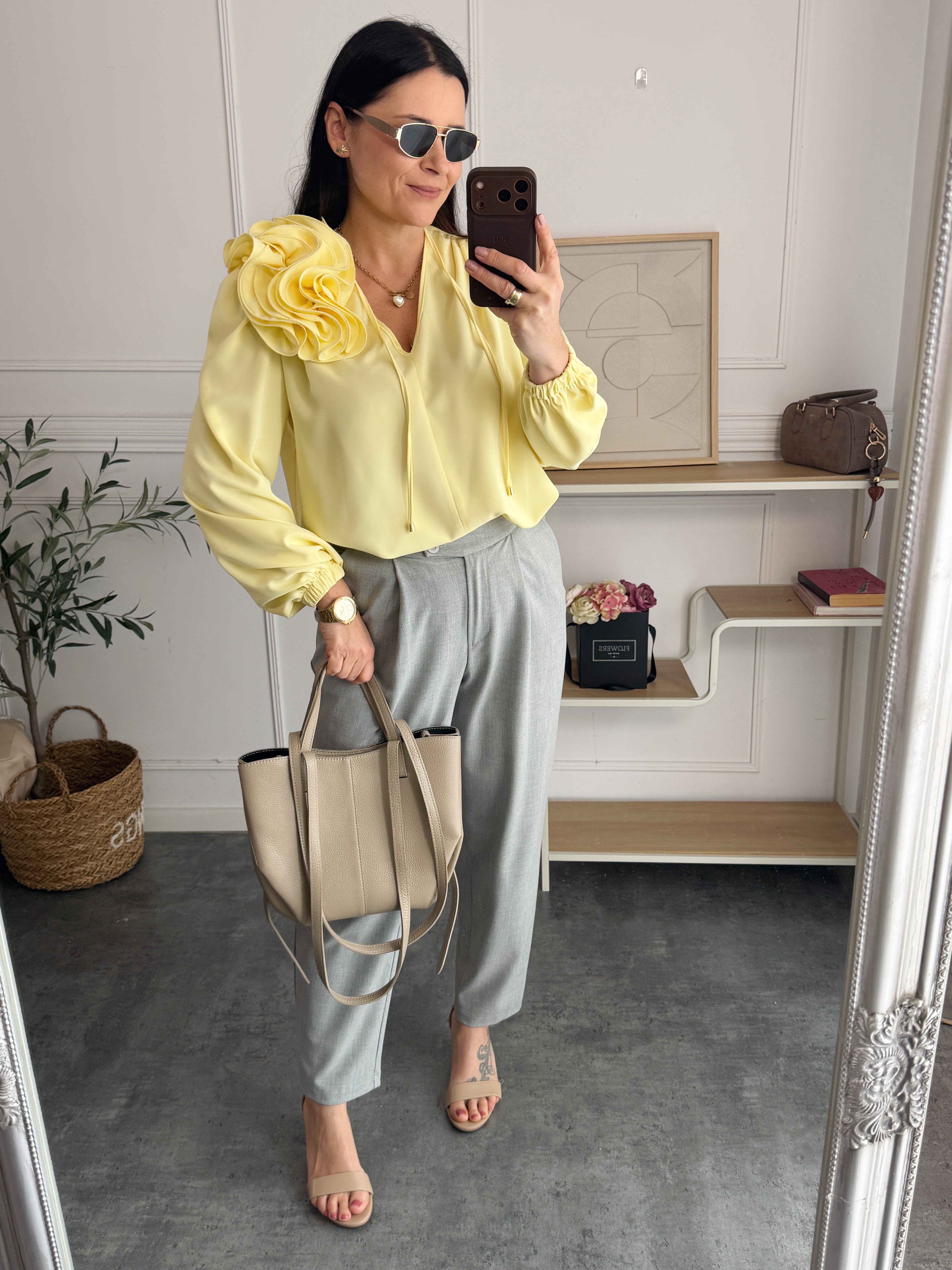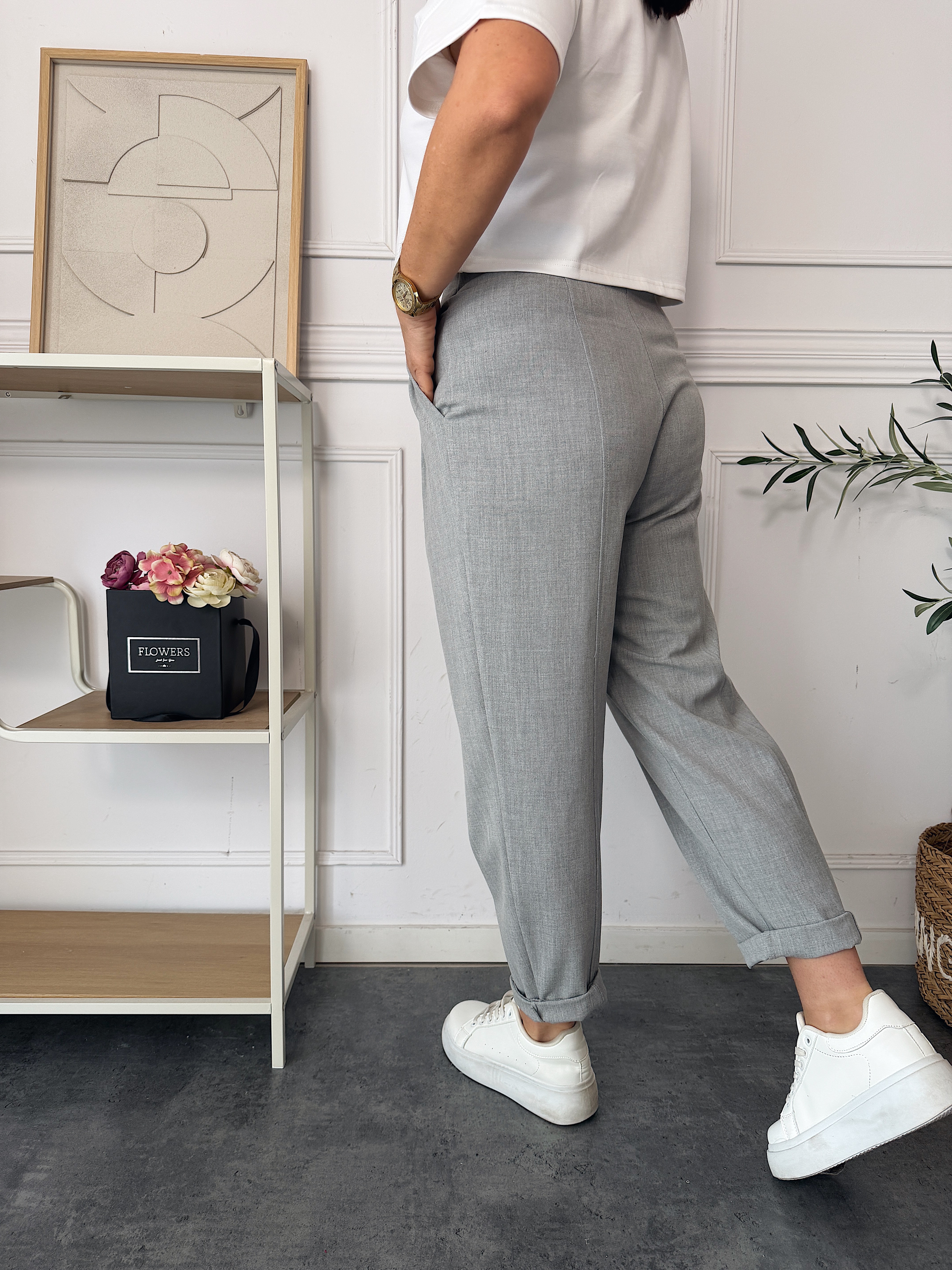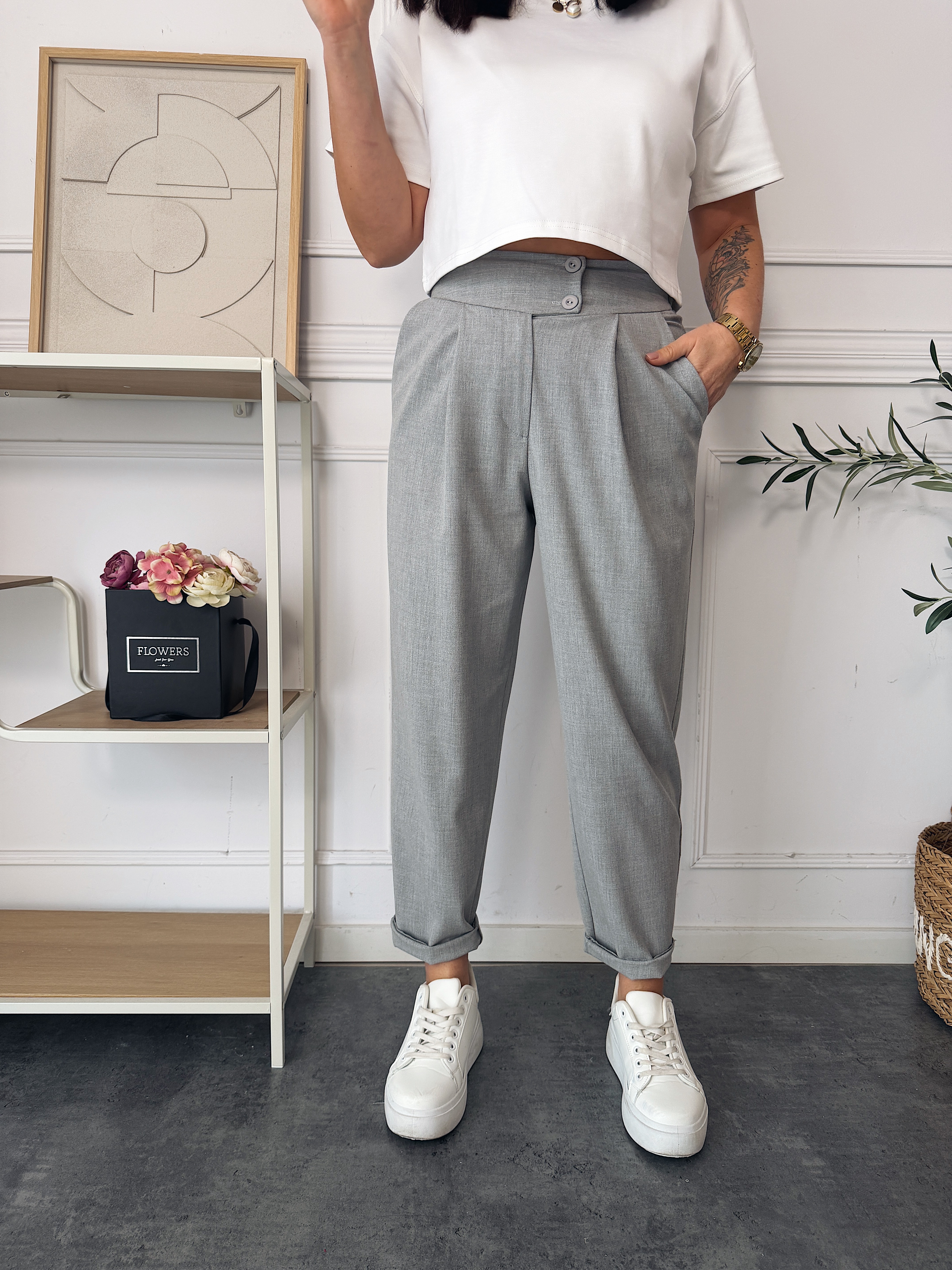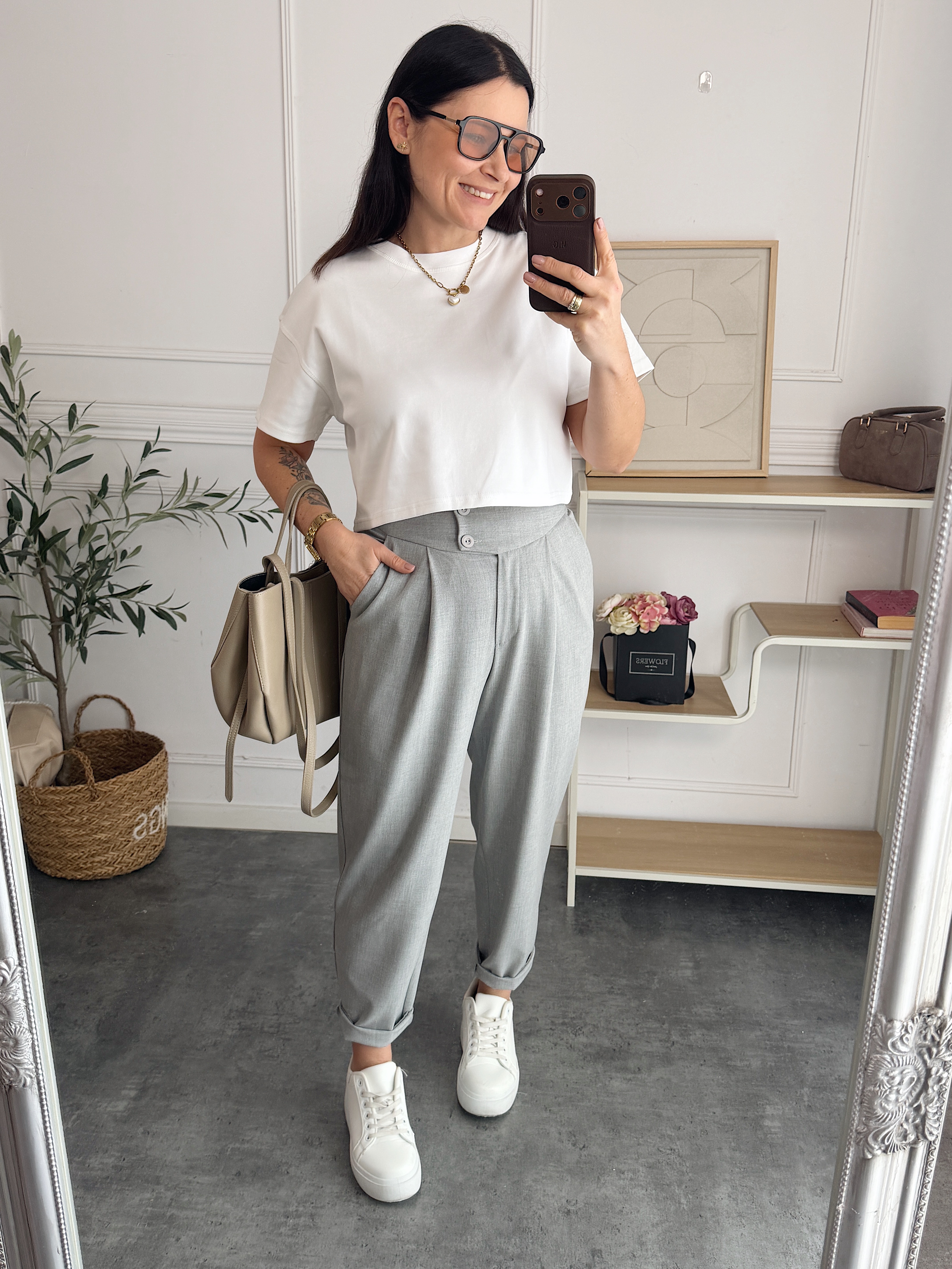 Spodnie eleganckie z gumką z tyłu w pasie to połączenie komfortu i klasycznego, dopracowanego stylu. Przód spodni jest gładki i zapinany na dwa guziki,