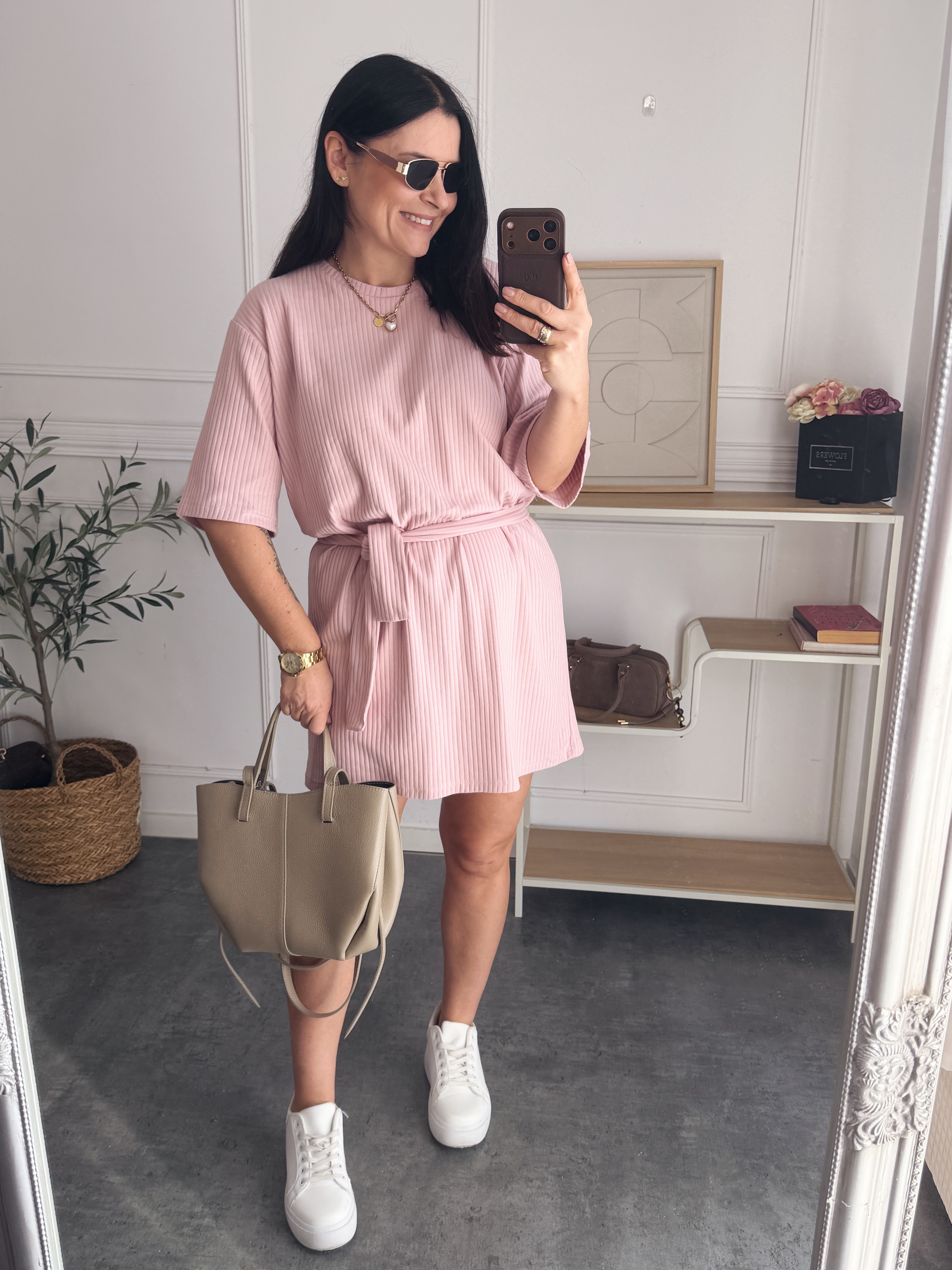 Do Sukienki dołączony jest pasek, dzięki któremu możesz nosić ją na dwa sposoby — luźno, dla bardziej sportowego efektu, lub przewiązaną w talii, aby podkreślić sylwetkę.