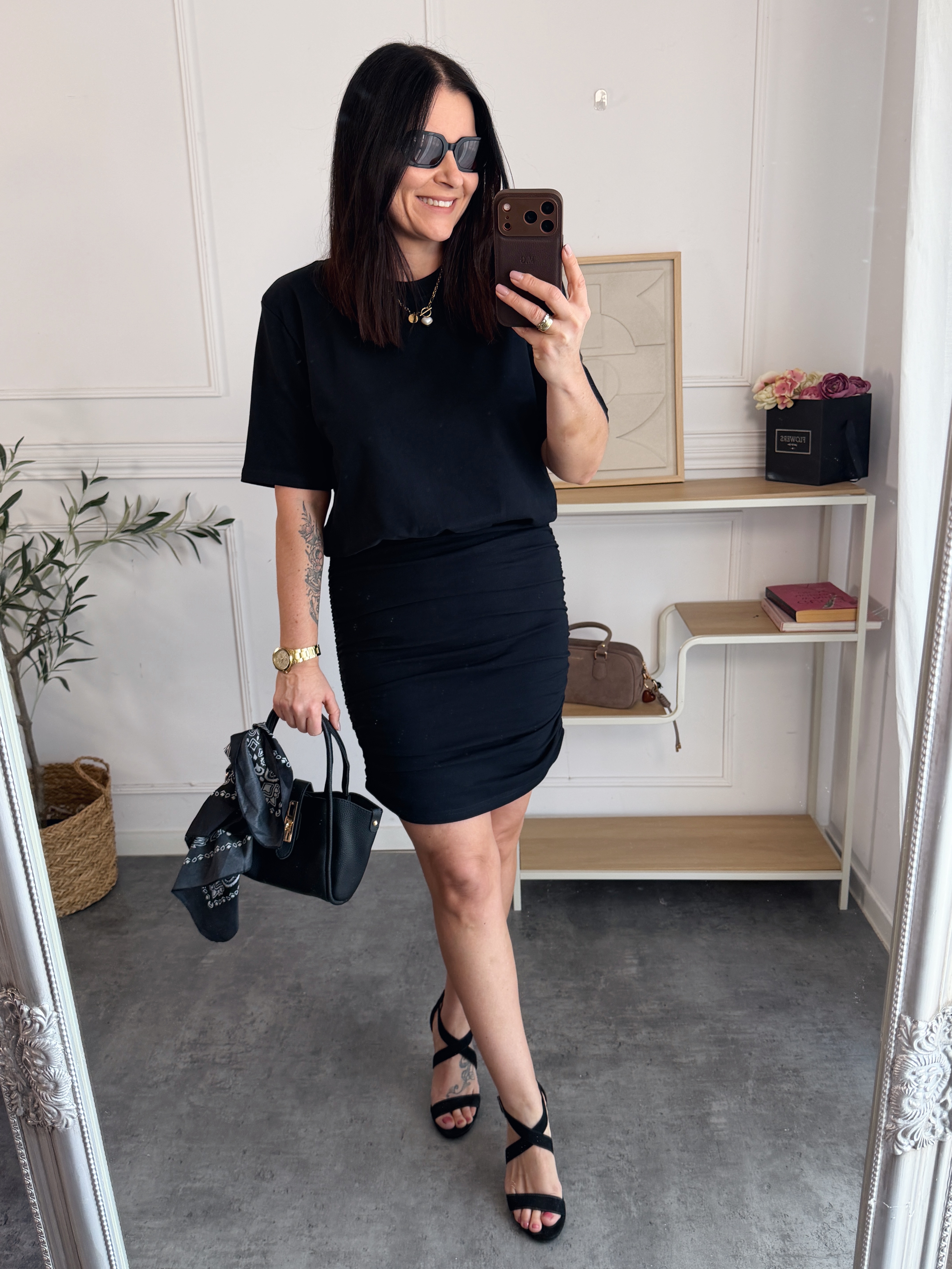 Sukienka wykonan z dresówki - model elastyczny , posiada poduszki na ramionach , drapowania- dzięki czemu ukryjesz niedoskonałości.