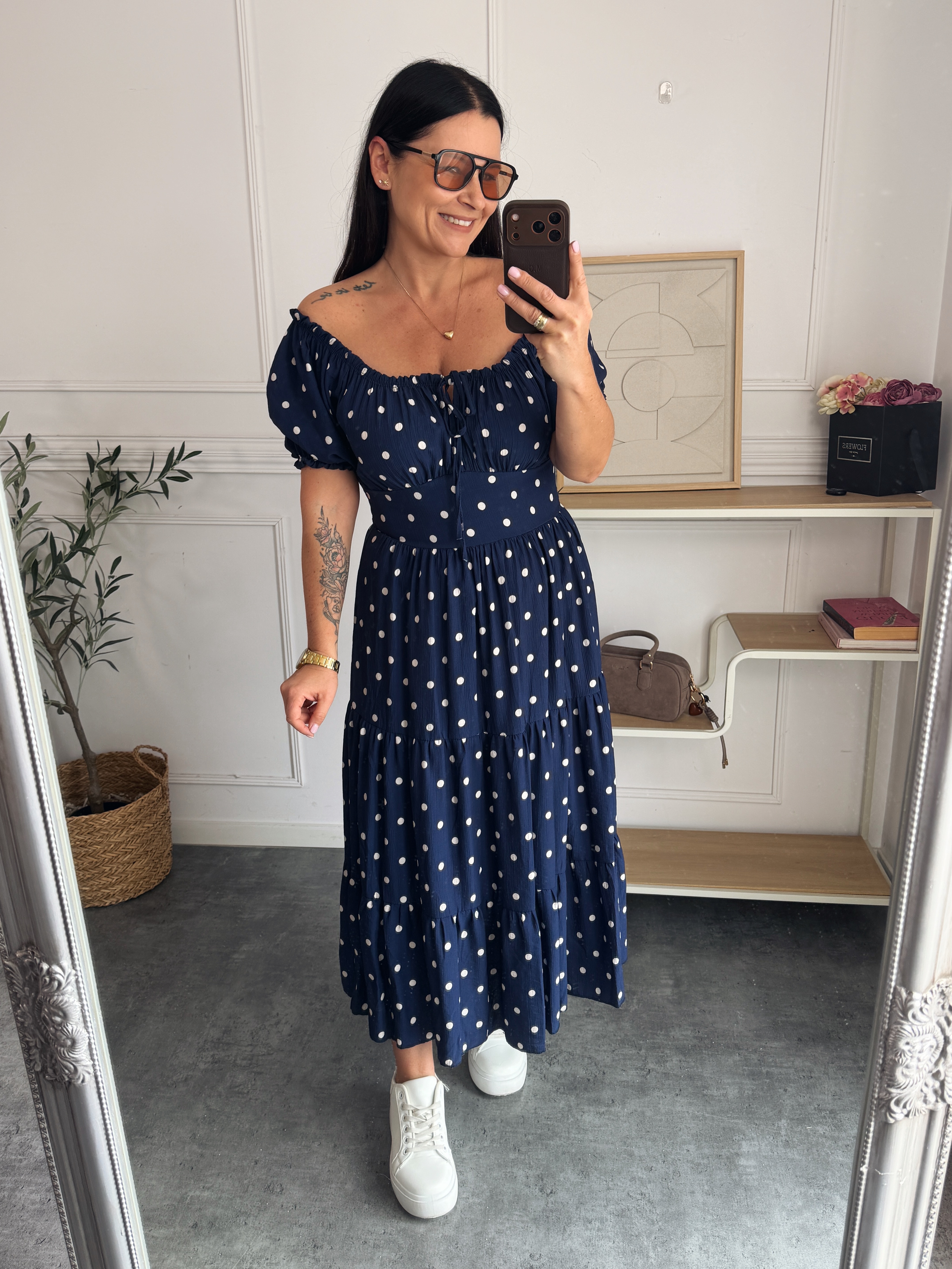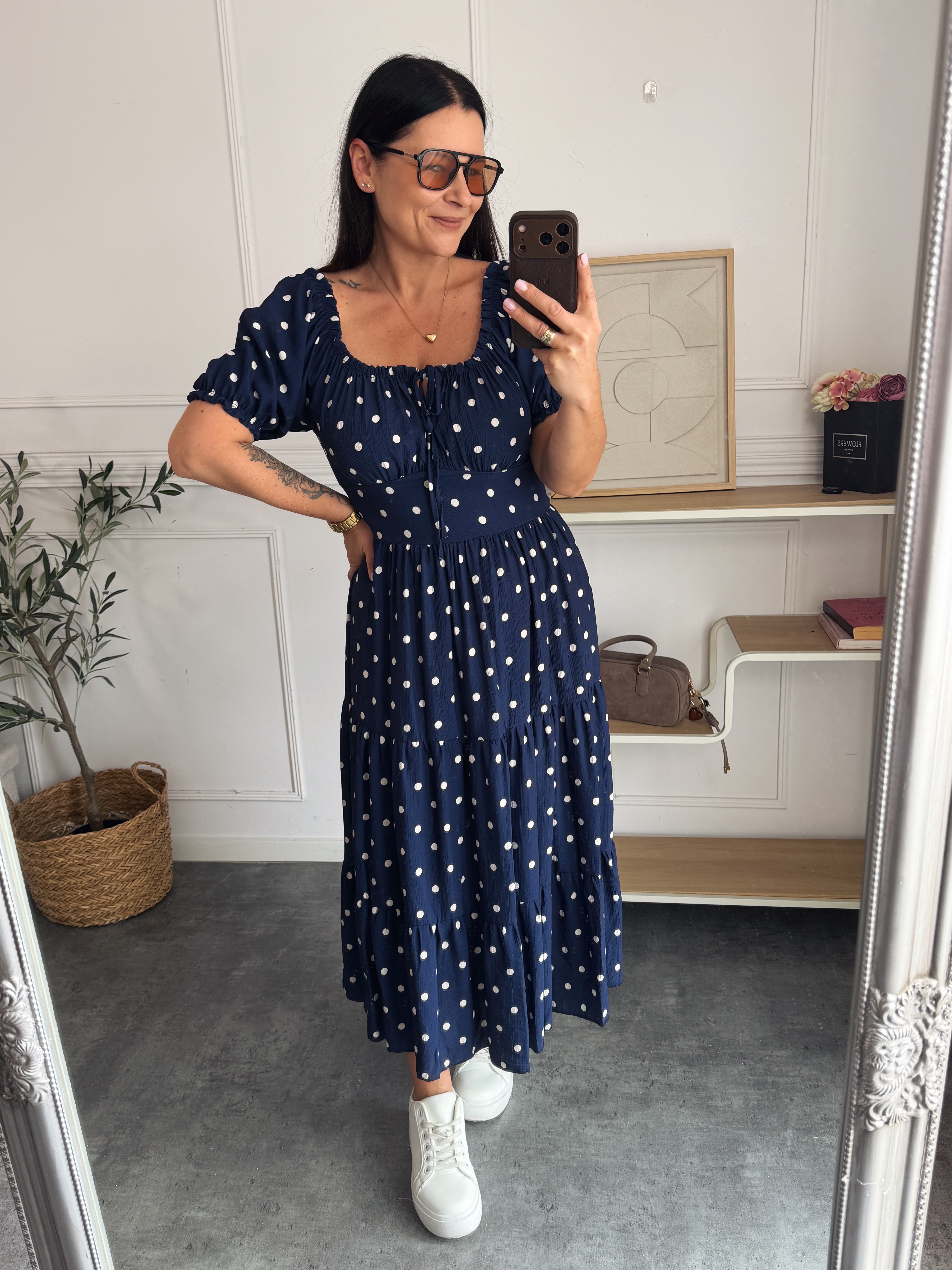 Sukienka Olivia Groszki Białe na Granatowym Tle