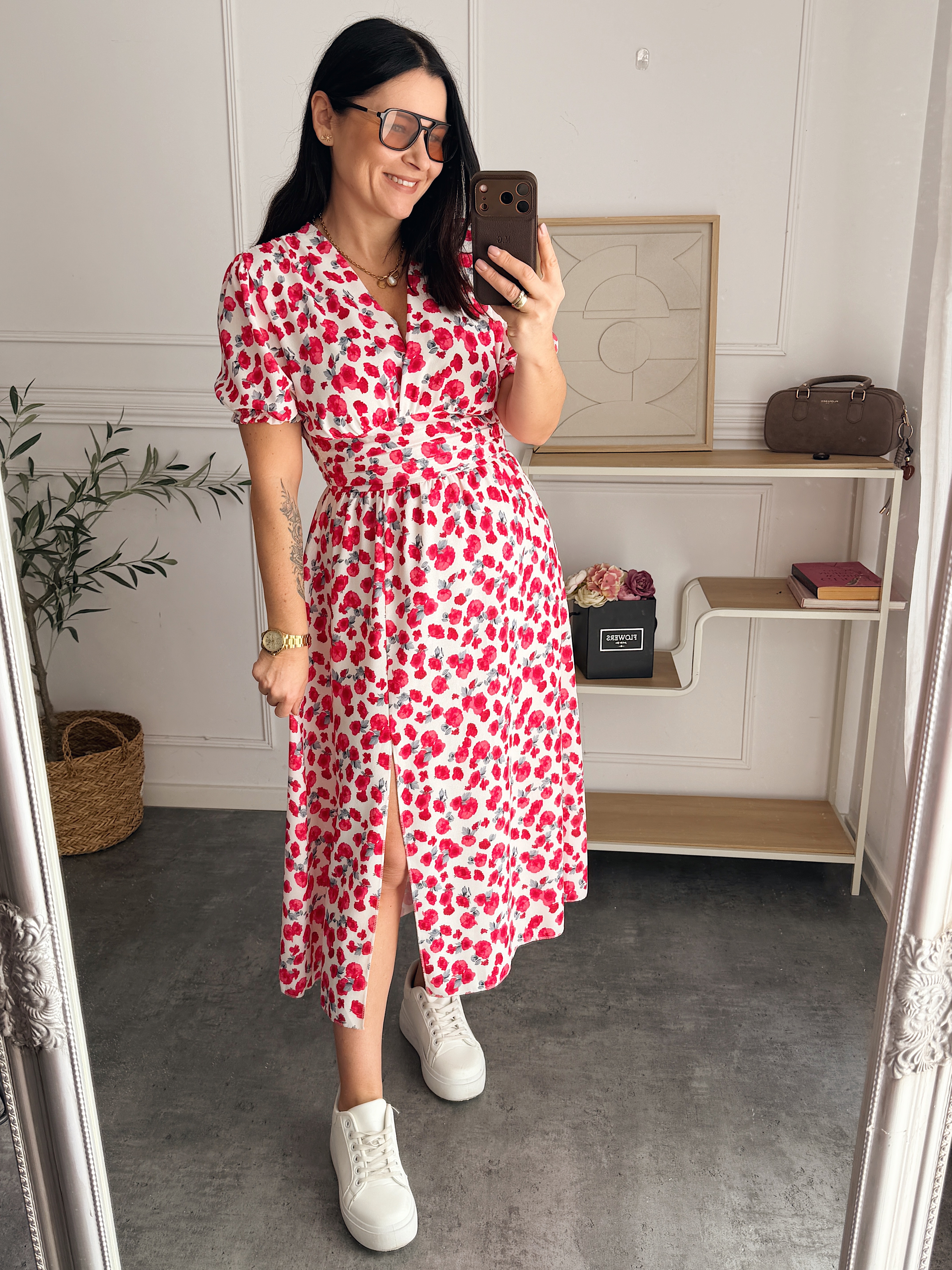 Sukienka długości midi , posiada kopertowy dekolt, w pasie odciecie ( z tyłu gumonici - dzięki czemu idealnie dopasuje się do sylwetki)
