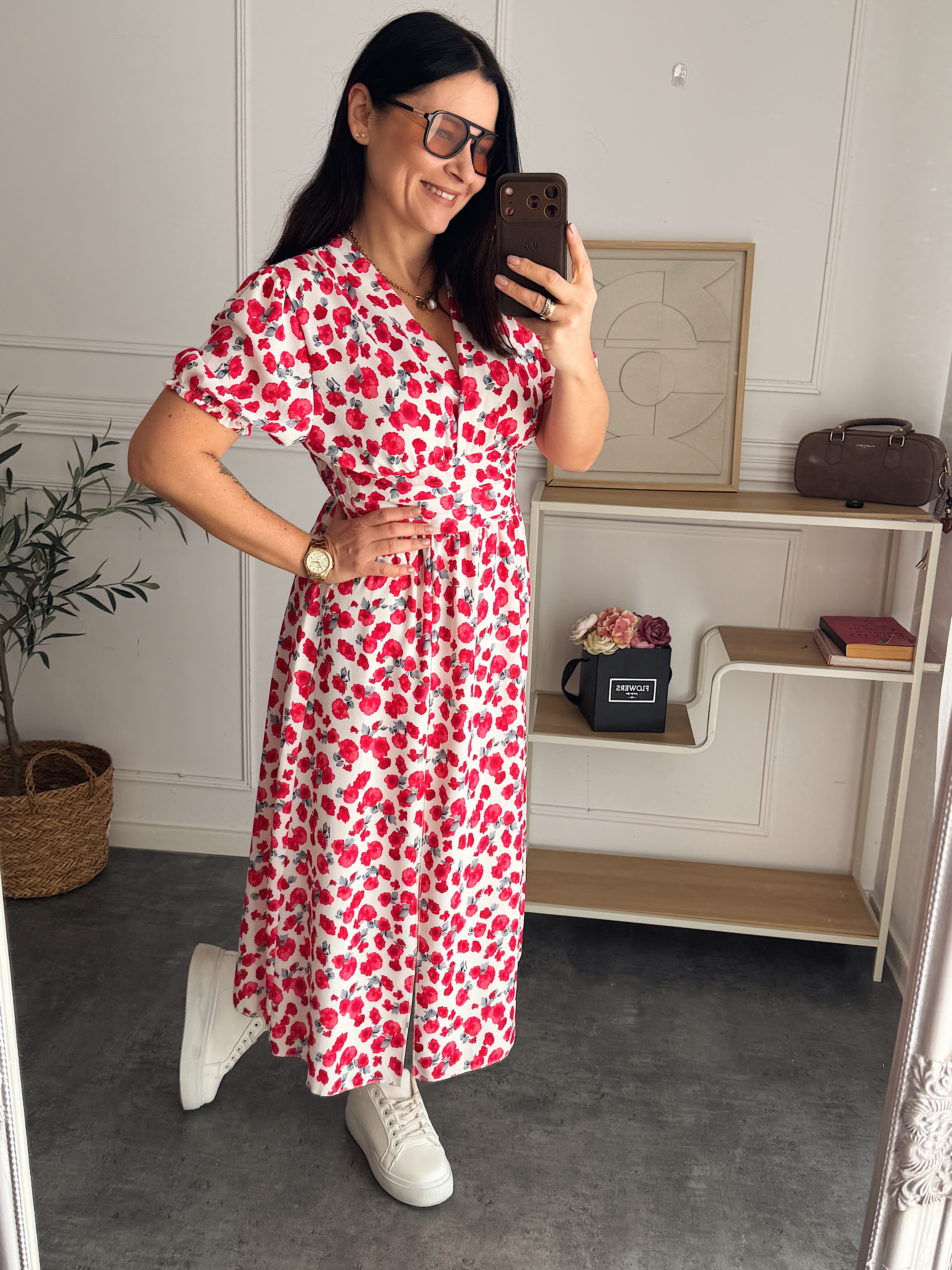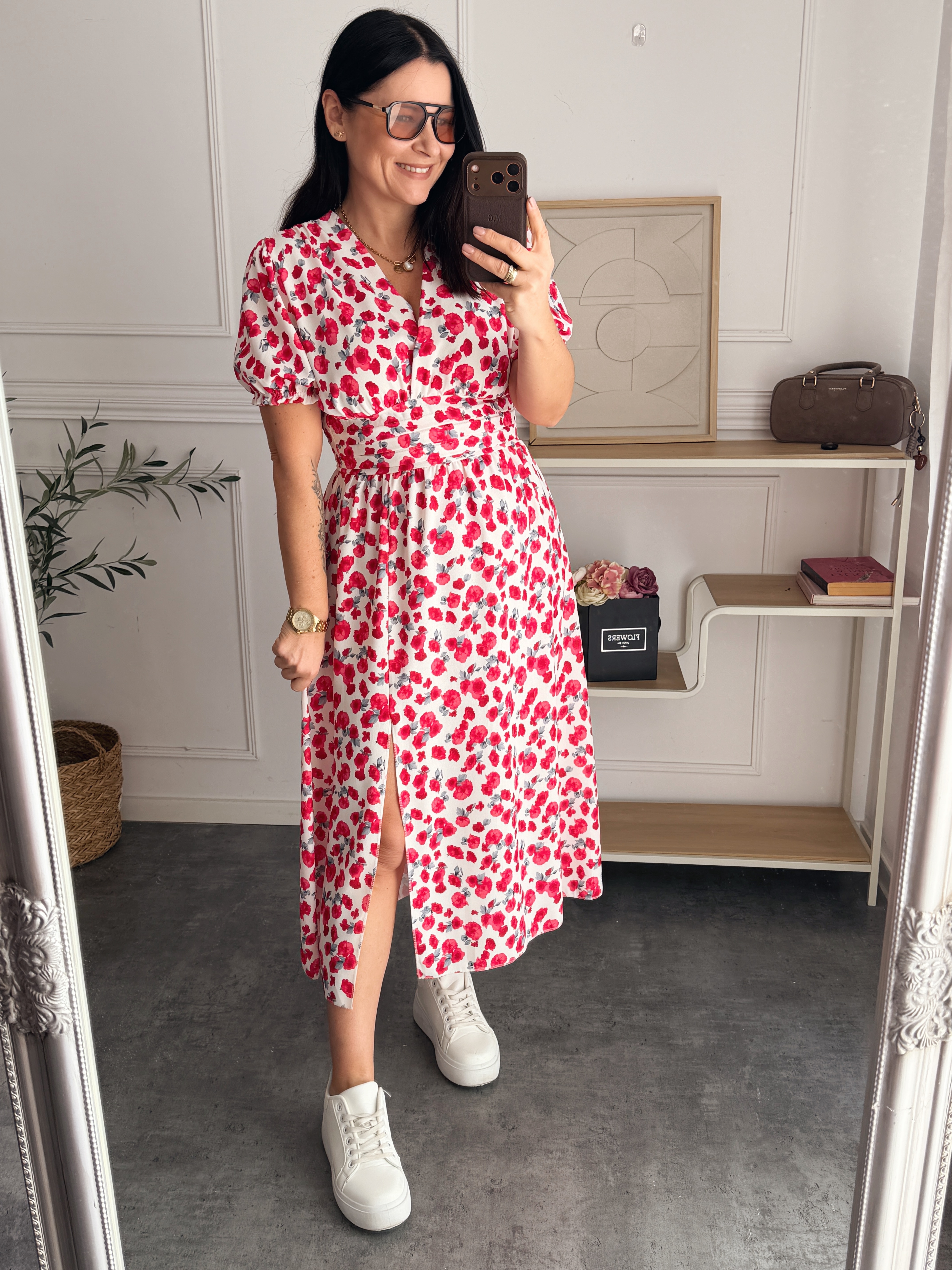 Sukienka Rossi Biała w czerwone kwiatuszki