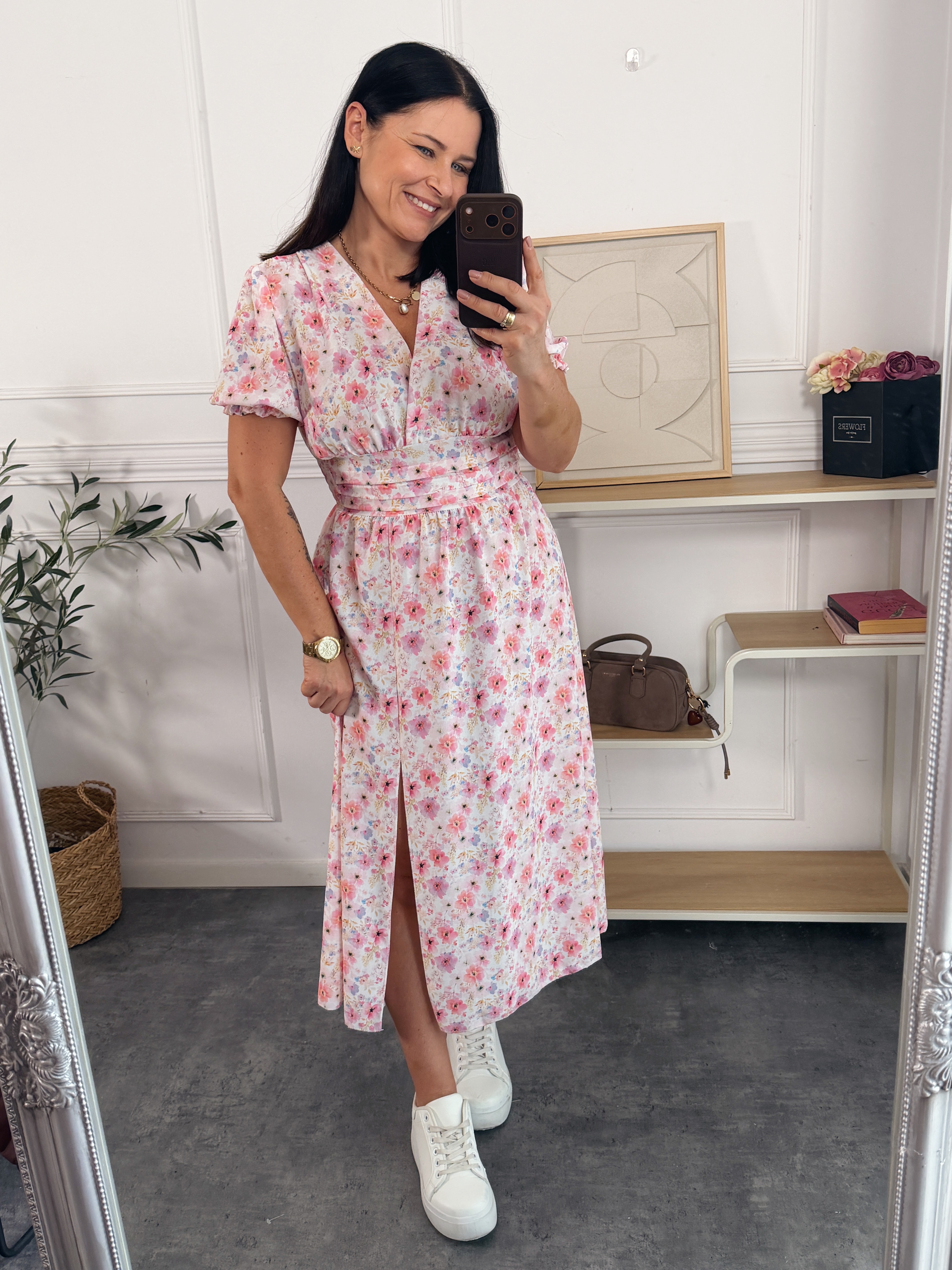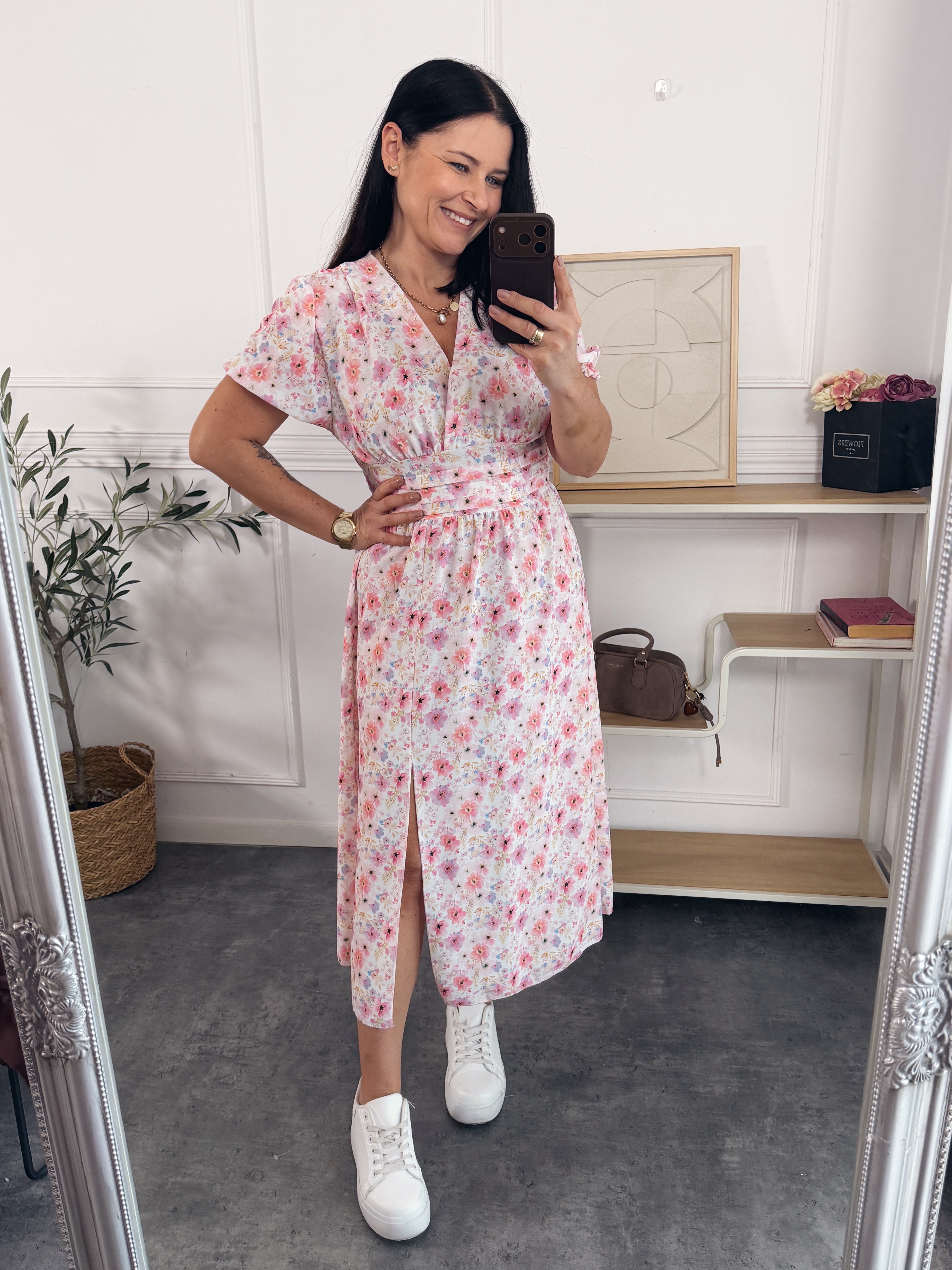 Sukienka długości midi , posiada kopertowy dekolt, w pasie odciecie ( z tyłu gumonici - dzięki czemu idealnie dopasuje się do sylwetki)